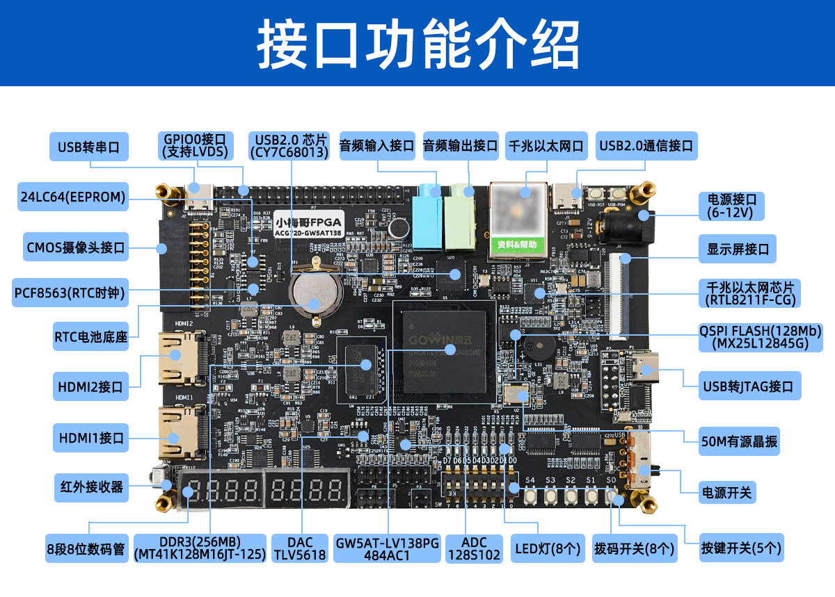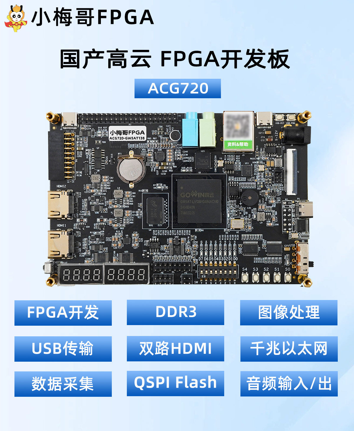 ACG720 开发板板载高云 GW5AT-60/138K 高性能 FPGA 芯片,标配256MB DDR3与128Mb QSPI Flash,保障复杂算法与视频图像处理的运行能力;配备50M 有源晶振提供精准时钟,电源接口支持 6-12V 宽压供电,基础硬件架构稳定。