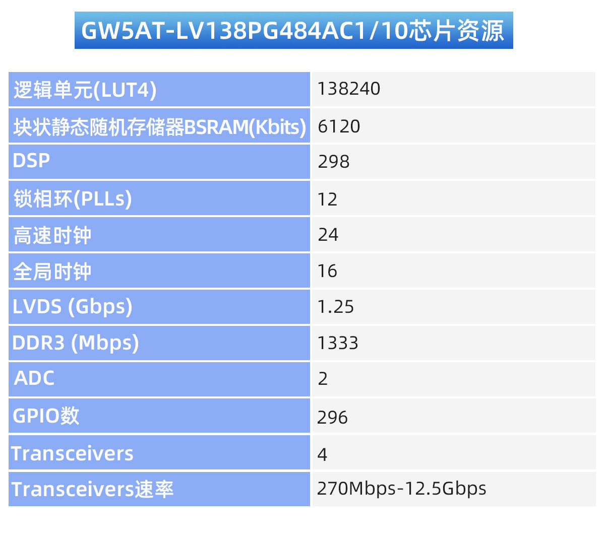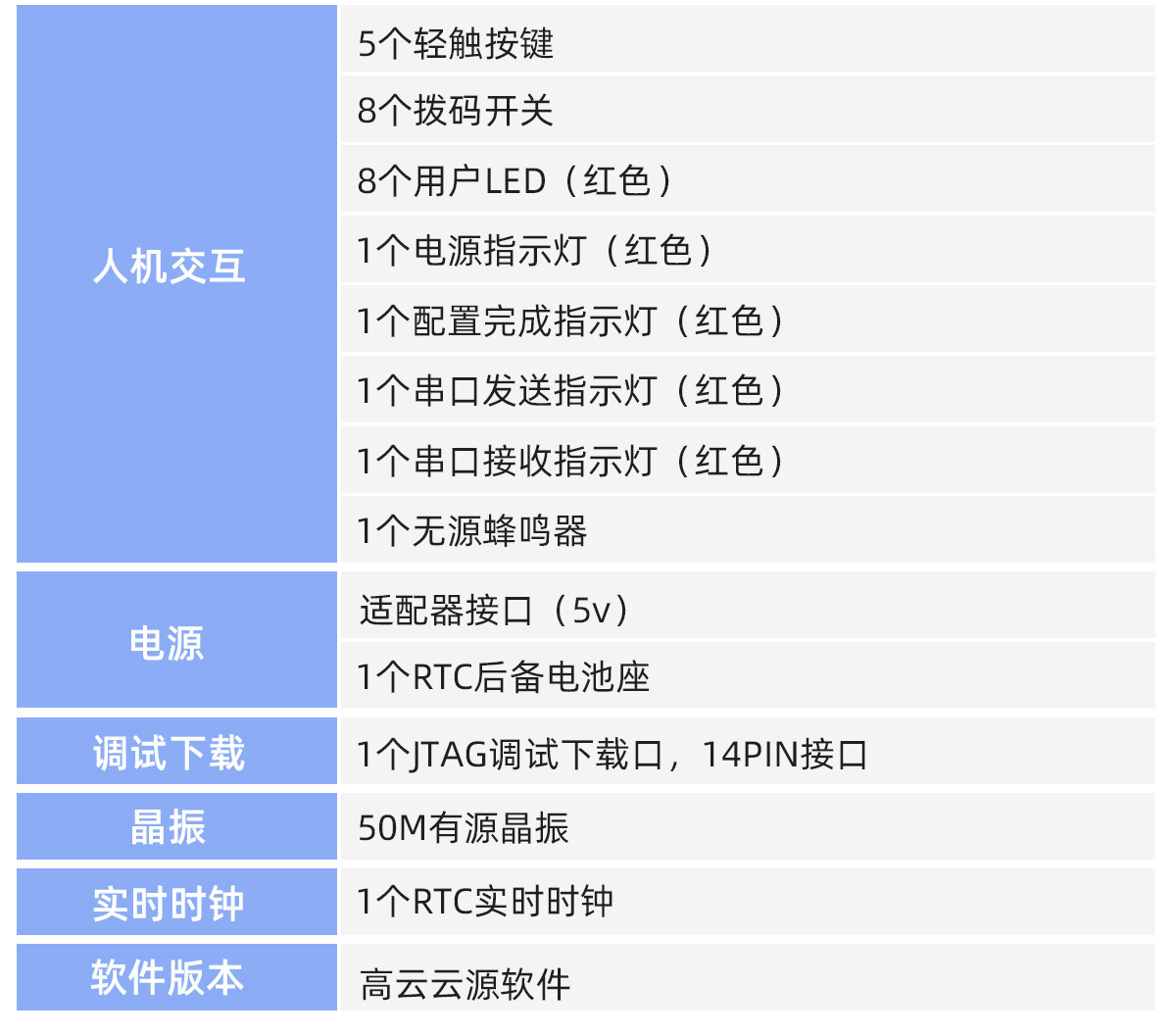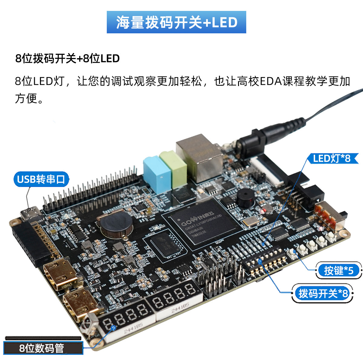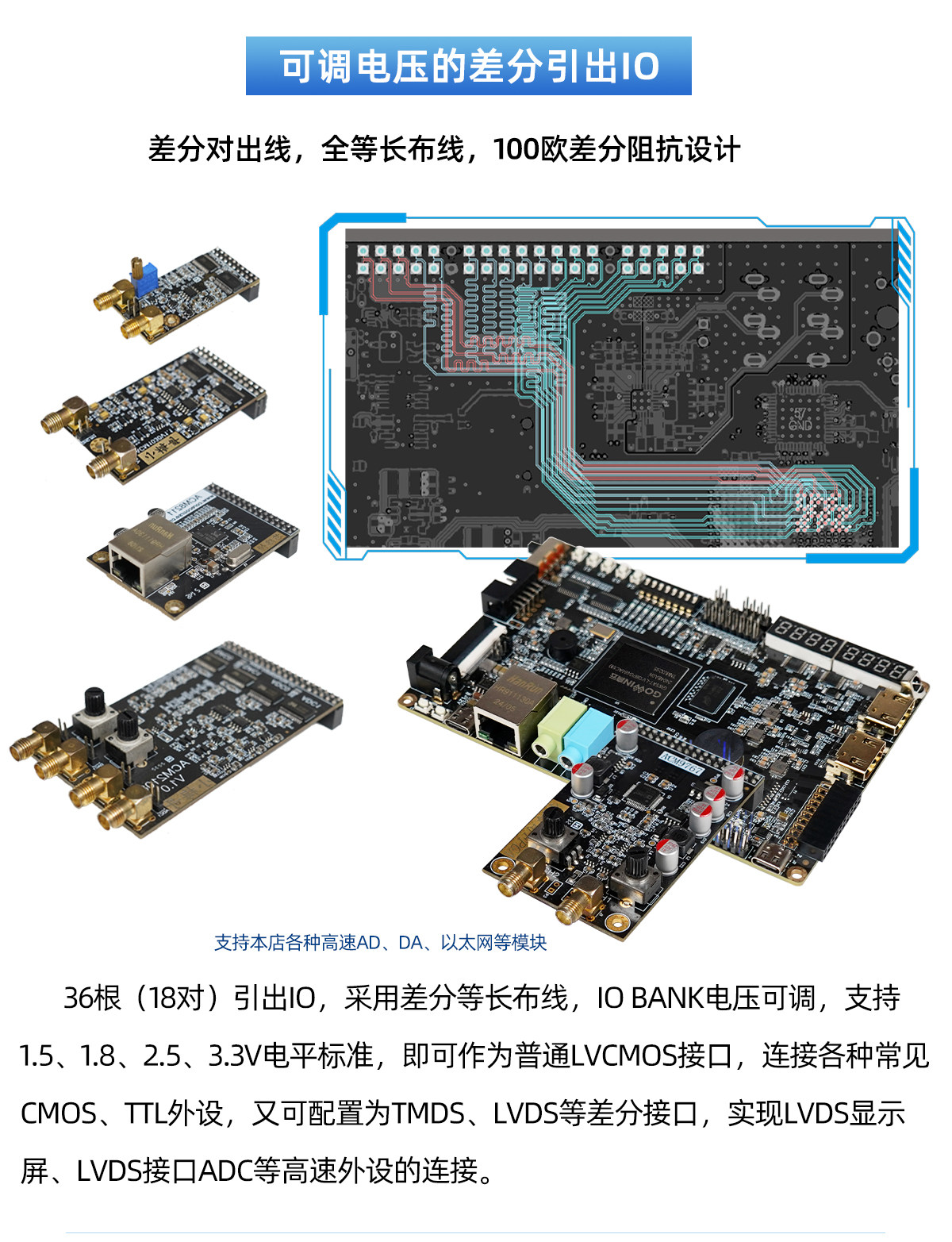 外设与 IO:提供8 位拨码开关、8 个 LED、5 个按键与8 段 8 位数码管,便于快速调试;可调电压差分 IO支持 1.5/1.8/2.5/3.3V 电平标准,兼容 LVDS、TMDS 等差分接口,适配高速 AD/DA 及工业外设。