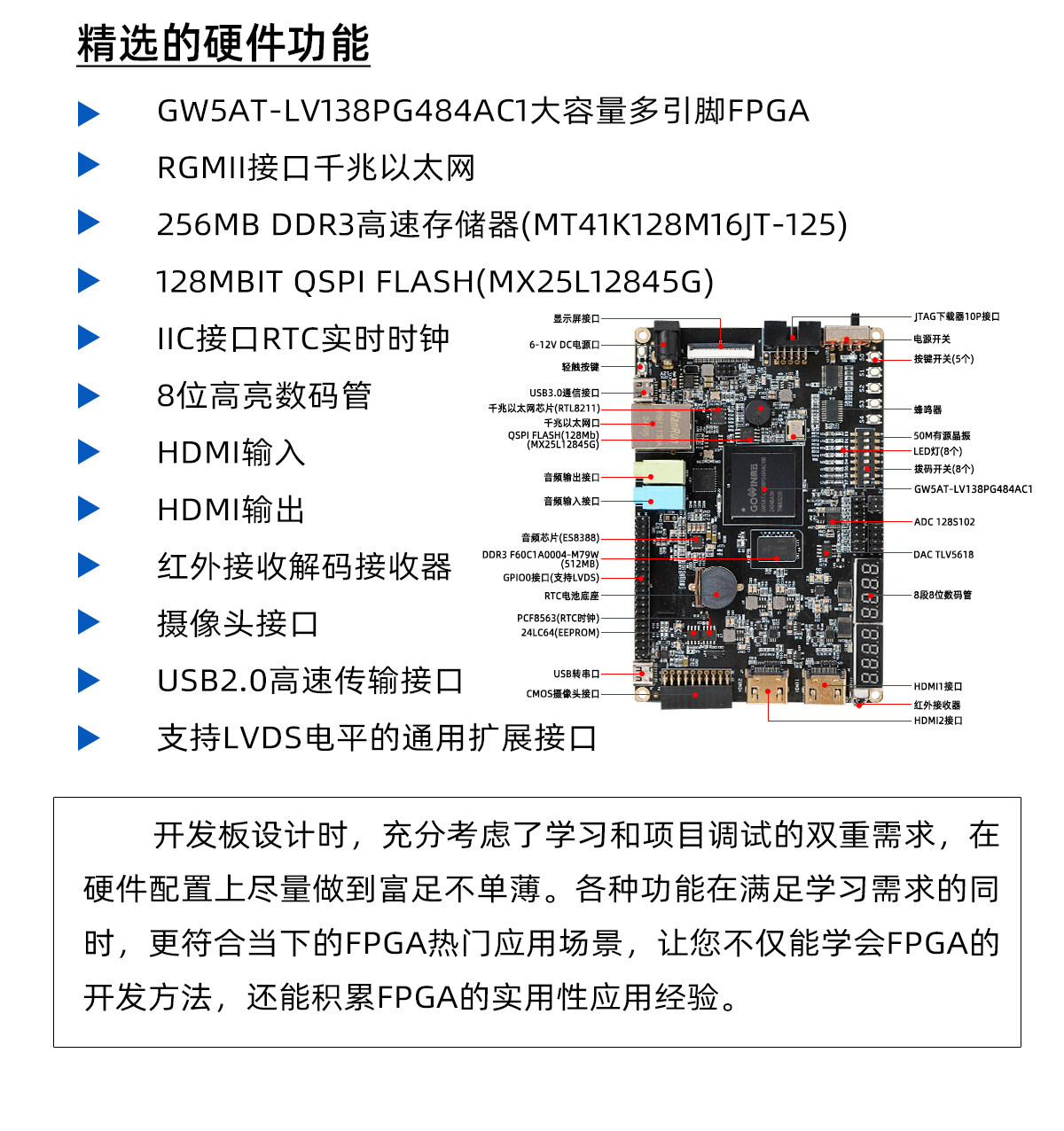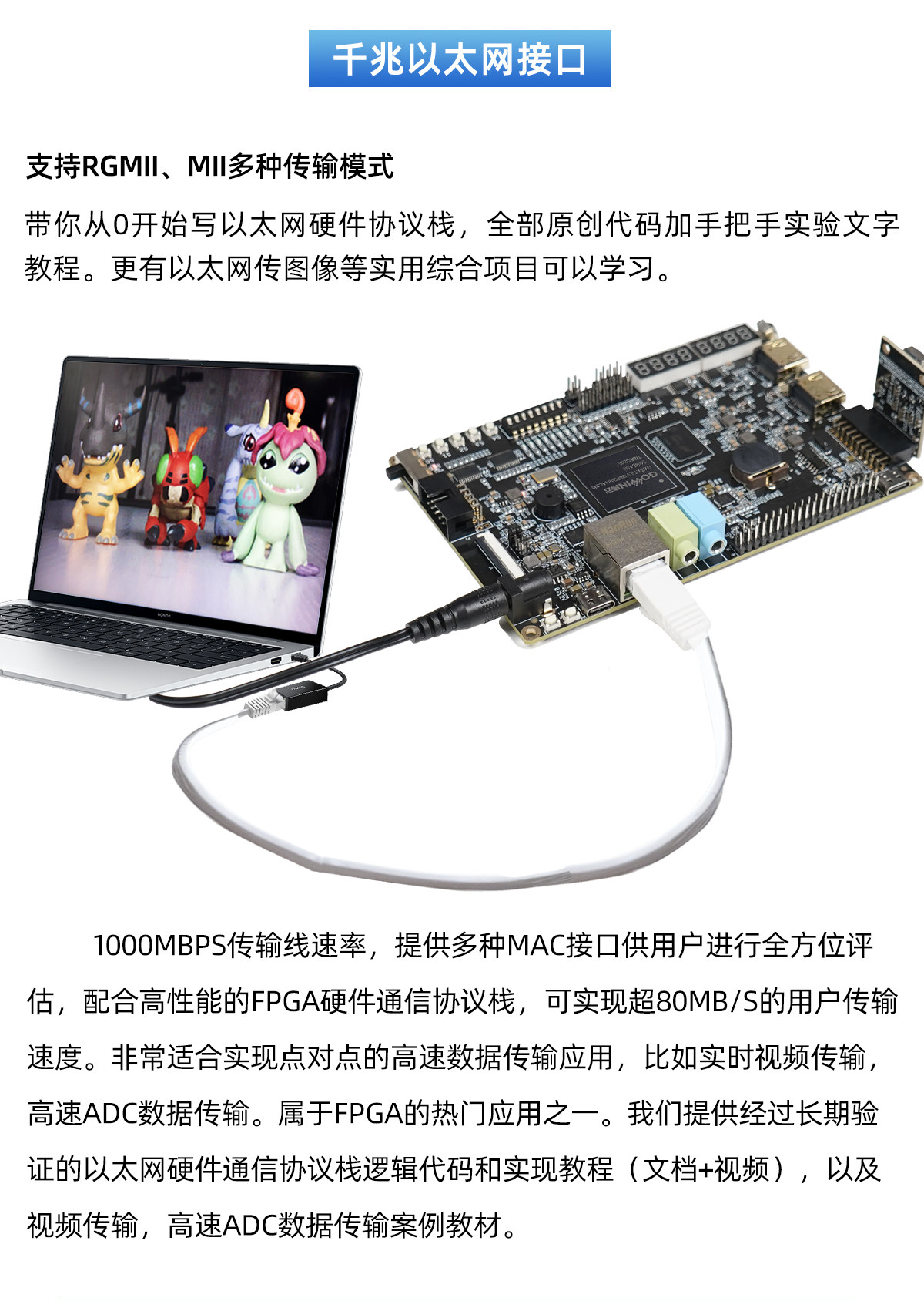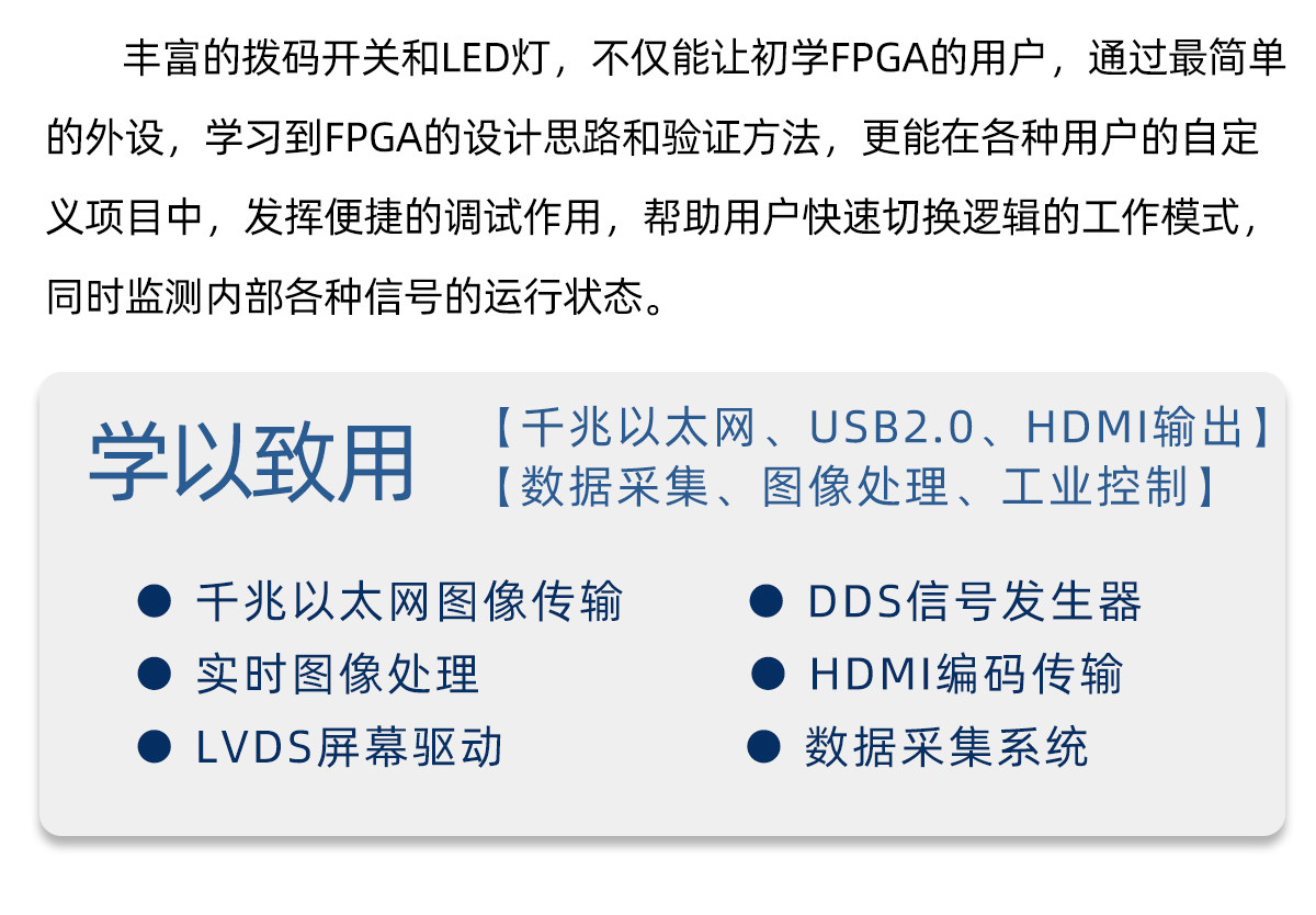 该开发板以实战项目为导向,覆盖千兆以太网图像传输、实时图像处理、LVDS 屏幕驱动、DDS 信号发生器、高速数据采集等热门应用场景,并配套完整的硬件协议栈代码、教程与案例,兼顾教学与项目开发,是 FPGA 全流程学习与开发的高性价比平台。
