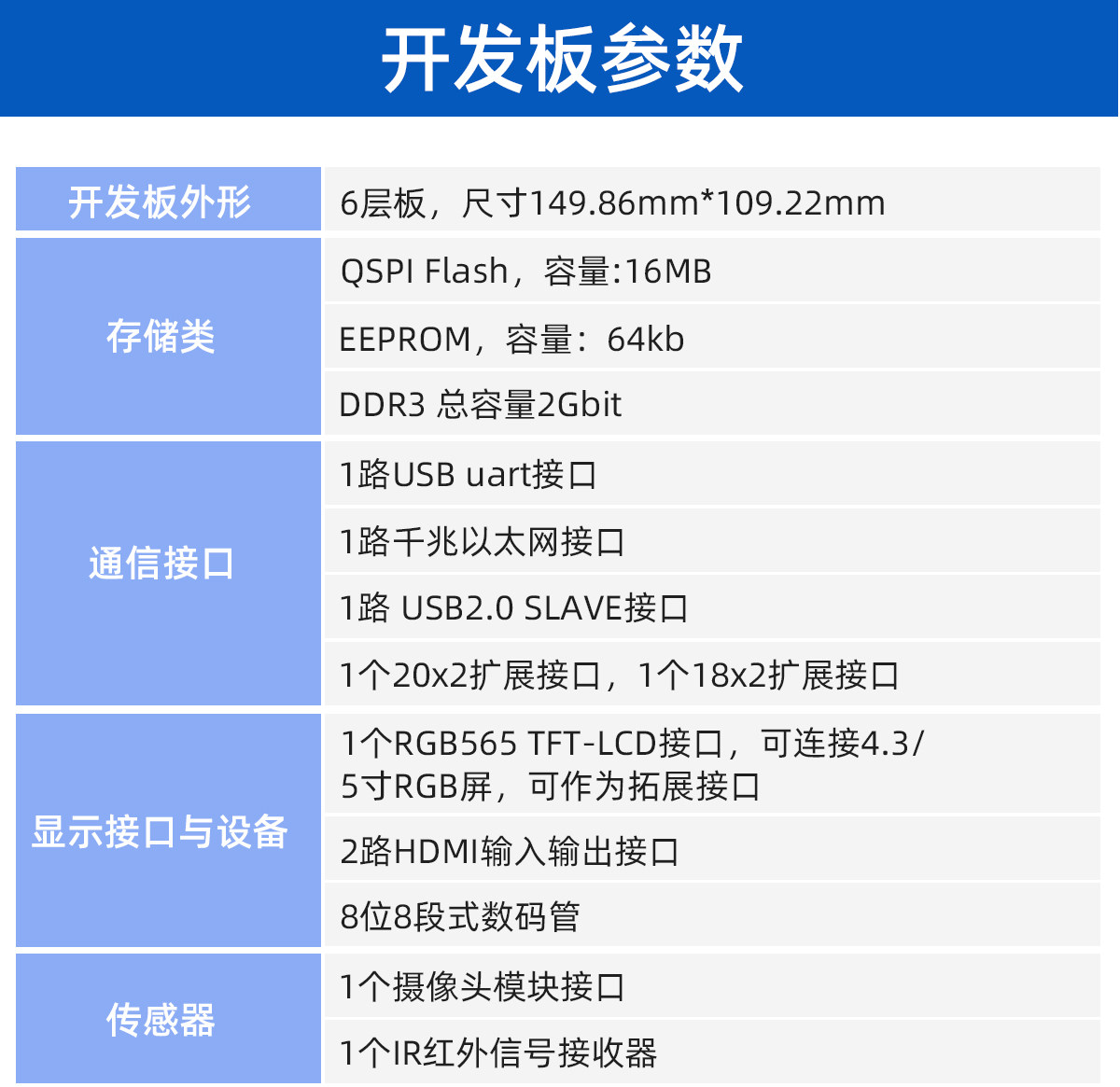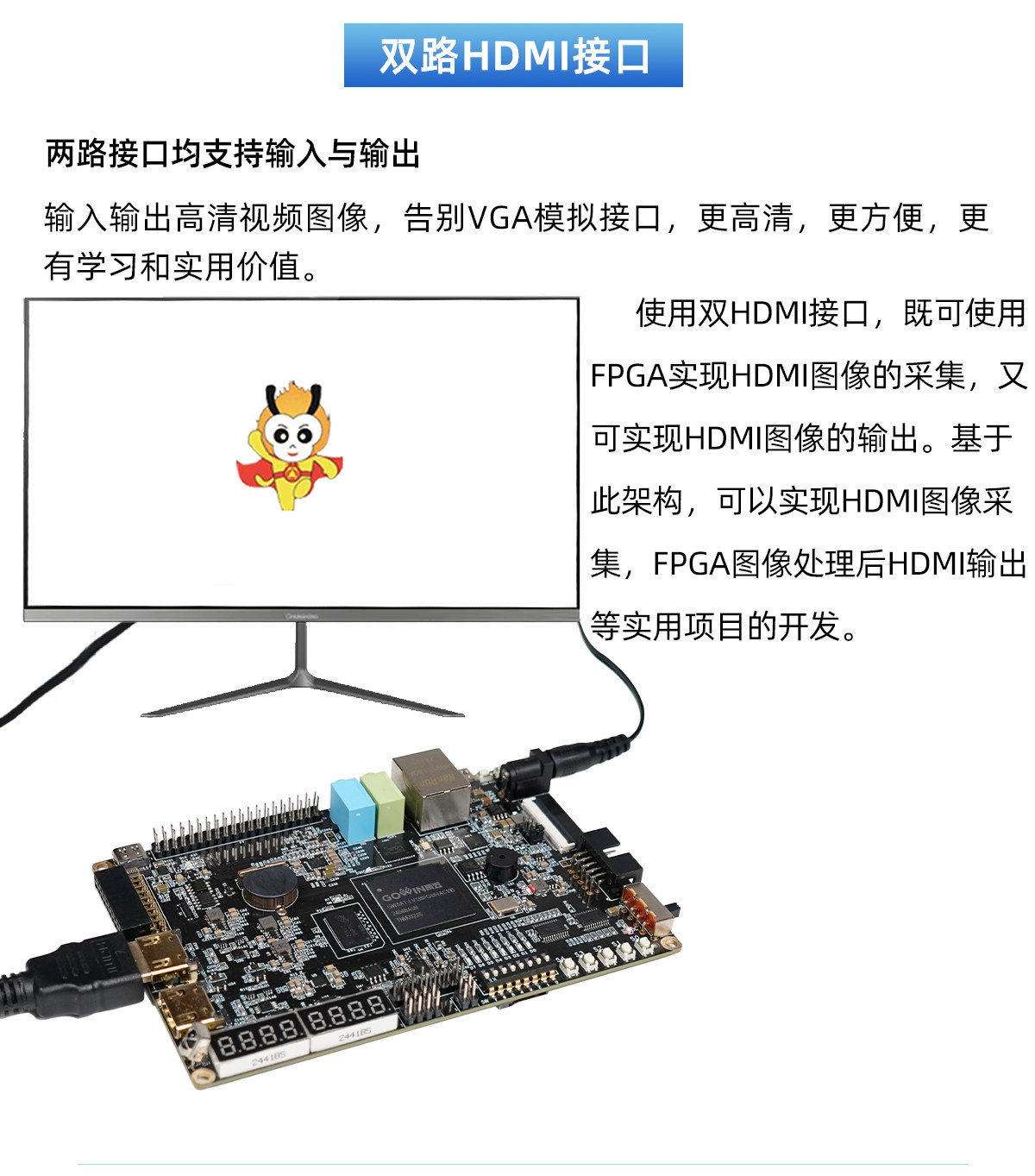 视频处理:双路HDMI 接口均支持输入输出,可完成视频采集、FPGA 图像处理与输出;CMOS 摄像头接口与显示屏接口拓展视觉应用场景;